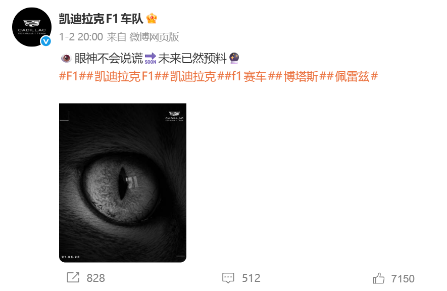 而在他与法拉利分道扬镳之后,凯迪拉克车队又第一时间晒出了一张猫眼睛的照片,图片左下角有一串数字——2026年1月5日,并附文:眼神不会说谎,未来已然预料。